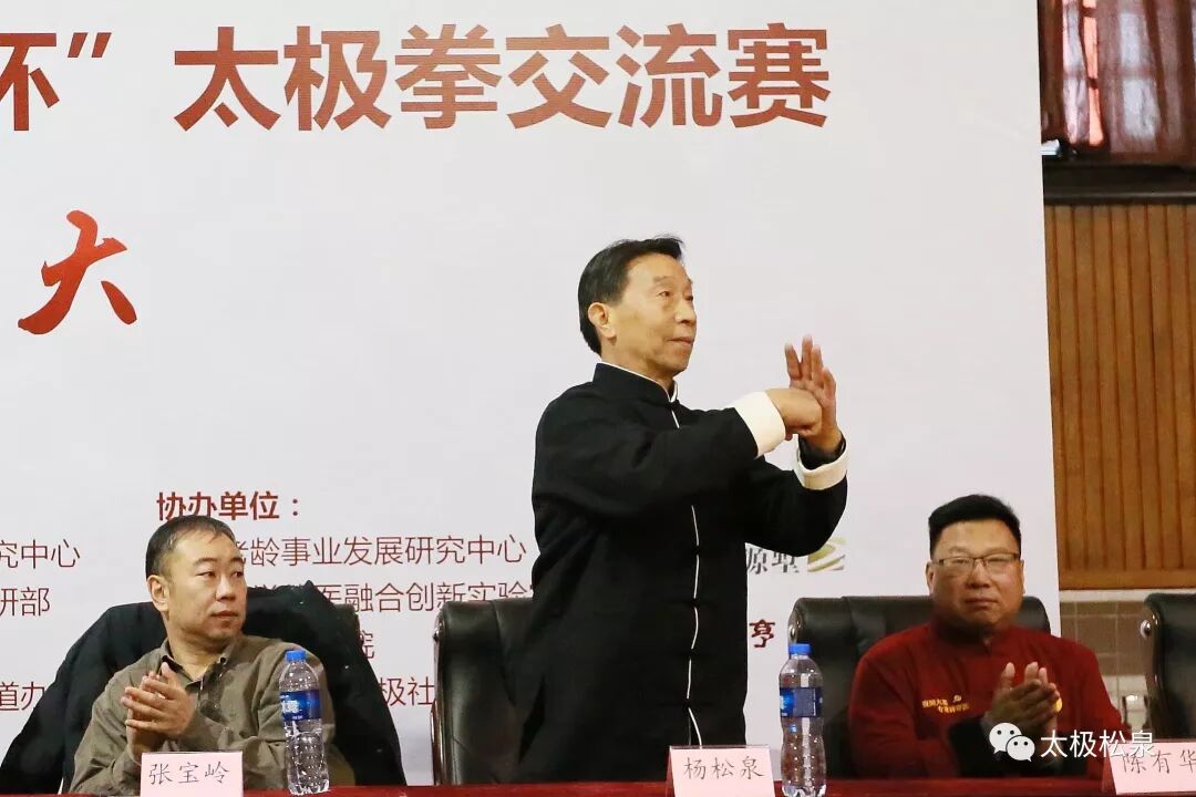 陈式太极拳第十一代传人、陈照丕大师亲传弟子、北京陈家沟太极拳协会会长、北京大学法学院太极总教练杨松泉先生受邀出席了大赛开幕式,并在“名家展演”环节展示了陈家老太极二路拳(炮捶),将二路拳刚柔相济、闪展腾挪、窜蹦跳跃、完整一气的拳法展现得淋漓尽致,有怪莽出洞、猛虎下山之气魄,有蛟龙出海、雄狮抖毛之神威,赢得全场观众的阵阵喝彩!