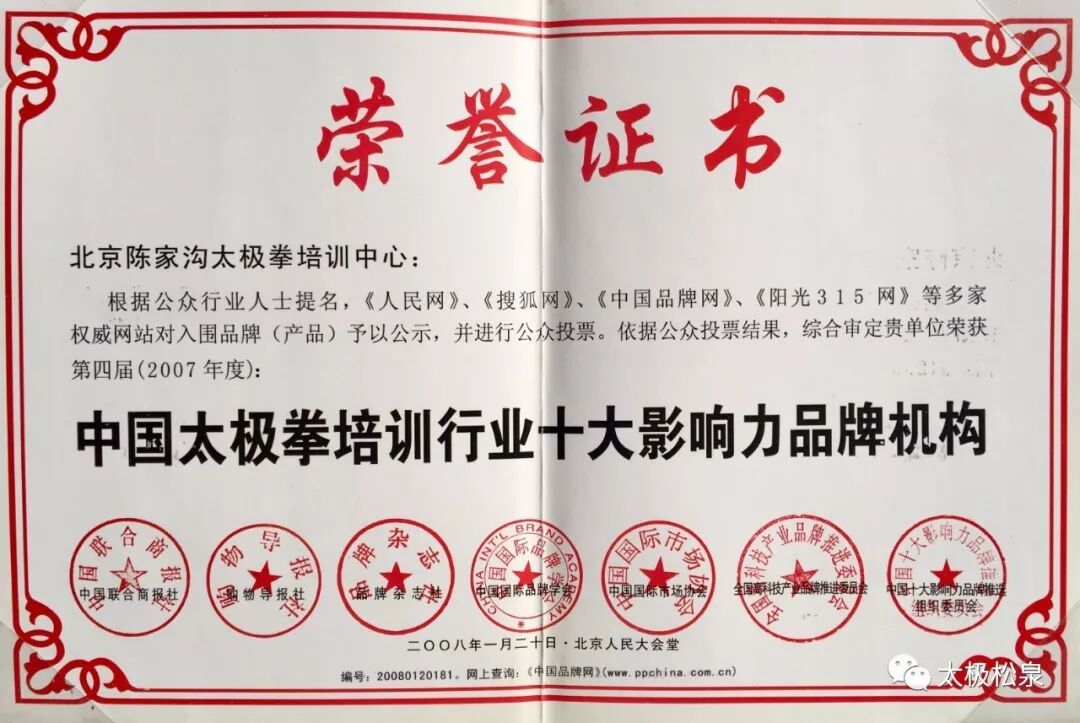 2008年,北京陈家沟太极拳培训中心荣获“中国太极拳培训行业十大影响力品牌机构”;