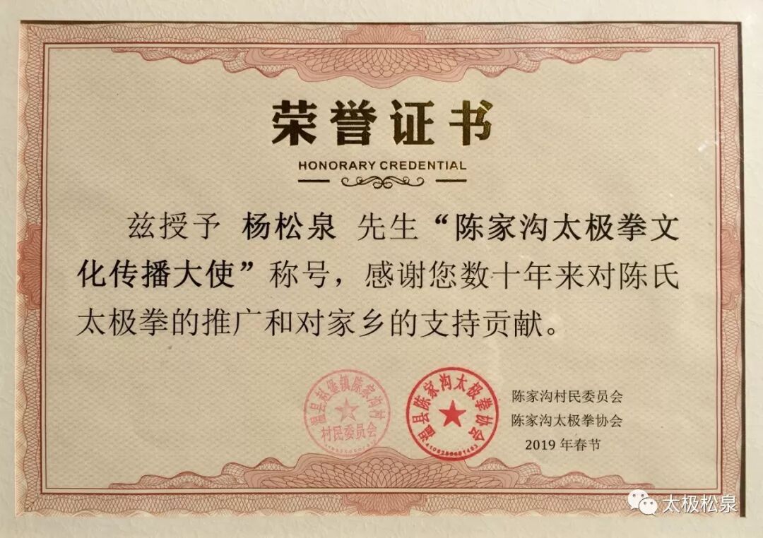 今年年初,陈家沟村民委员会、陈家沟太极拳协会共同为师父颁发荣誉证书,授予杨松泉先生“陈家沟太极拳文化传播大使”称号,感谢他数十年来对陈氏太极拳的推广和对家乡的支持贡献。
