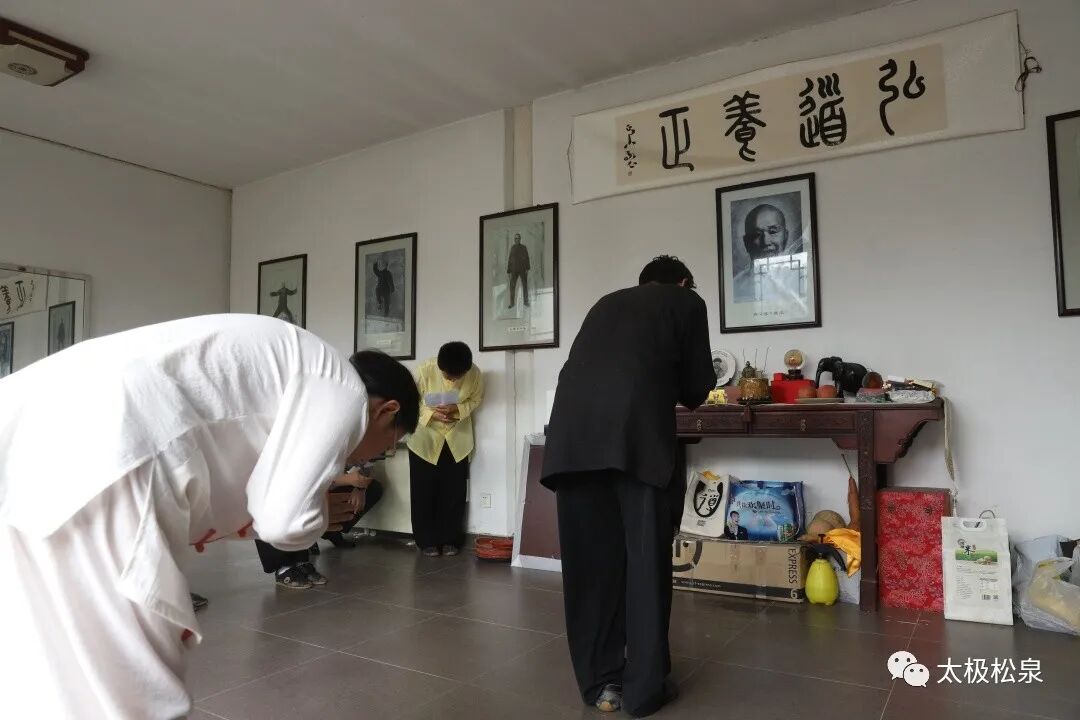 师父带领我虔诚拜祭先祖。一拜天,二拜地,三拜太极宗师陈照丕公,请求先祖保佑我们太极松泉团队。