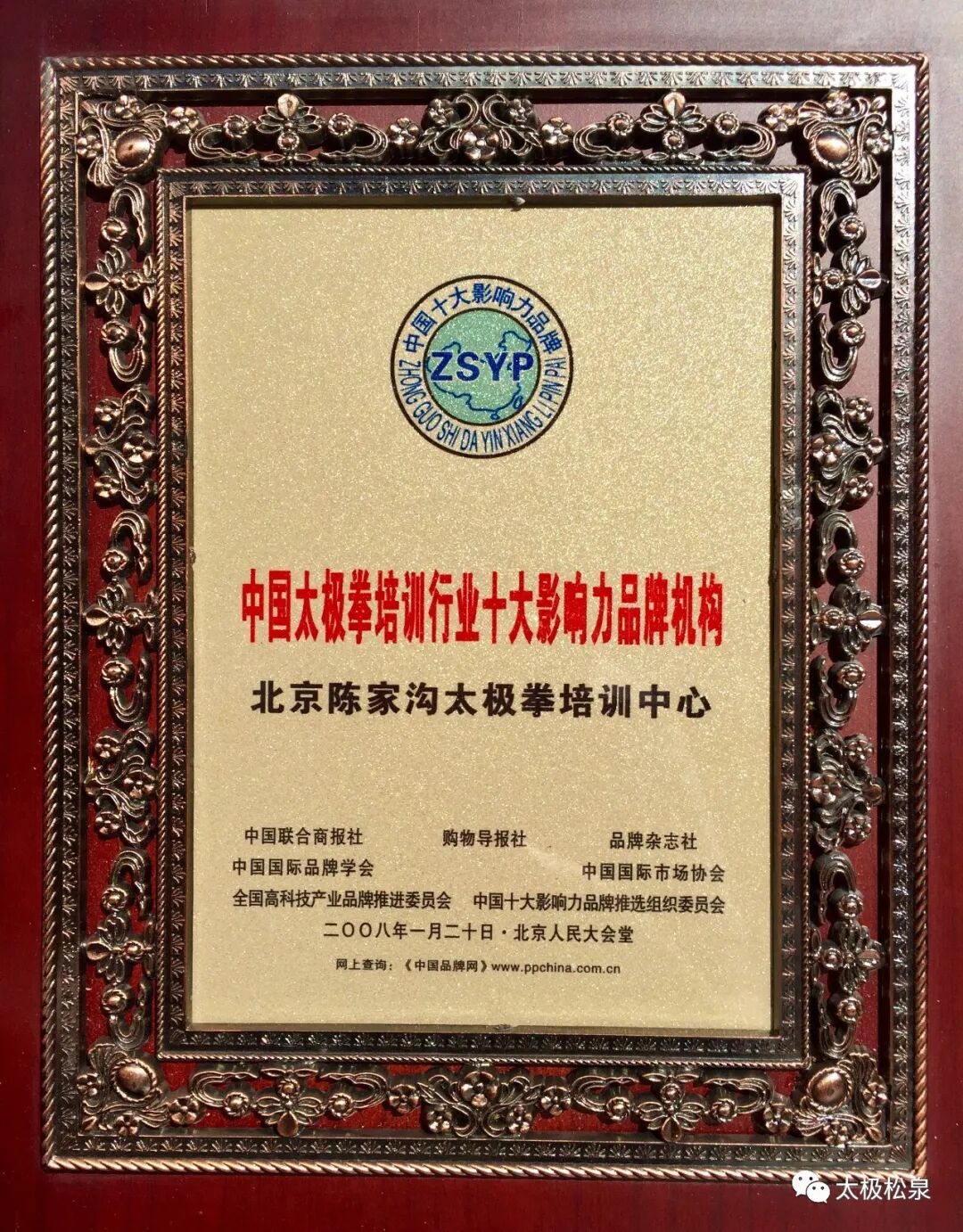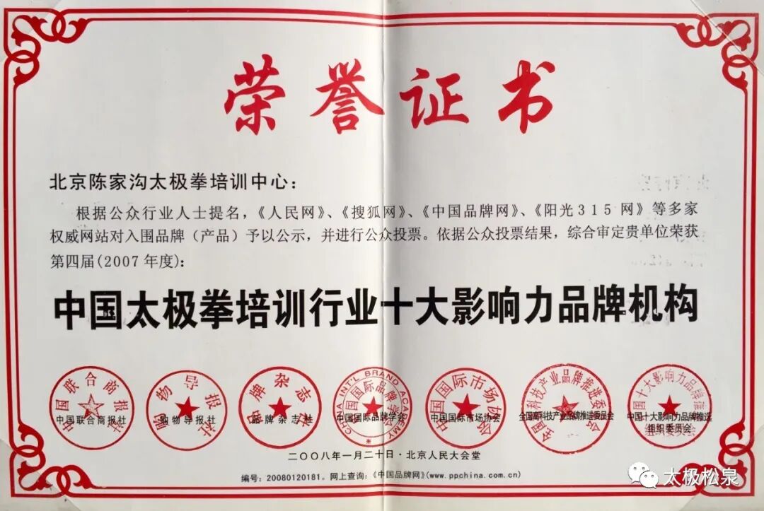2008年,由《人民网》、《搜狐网》、《中国品牌网》等多家权威网站予以公示和投票,北京陈家沟太极拳培训中心荣获“中国太极拳培训行业十大影响力品牌机构”,受邀至人民大会堂颁发荣誉证书。